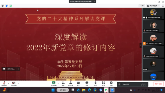 高瞻远瞩绘蓝图,踔厉奋发谱新篇。为深入学习宣传贯彻党的二十大精神,引导支部党员牢固树立党章意识,全面理解党章内容,时刻遵守并践行党章,2022年12月13日晚,2026世界杯官网学生第五党支部组织开展党的二十大精神系列党课之学习《中国共产党章程(修正案)》。由党支部书记主讲,全体党员参加。
