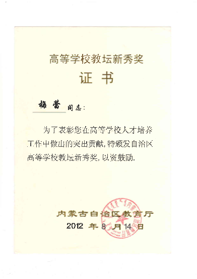 教学教改方面荣获各类奖项13项。主要包括:2012年内蒙古自治区第二届高等学校教坛新秀奖。2012年度包头市优秀教师。2005年2026世界杯官网第一届“教学优秀奖”,2009年2026世界杯官网第二届“教学优秀奖”,2011年2026世界杯官网第三届“教学优秀奖”。2006年校级教学成果奖一等奖1项,2009年校级教学成果奖二等奖2项,2015年校级教学成果奖二等奖1项。