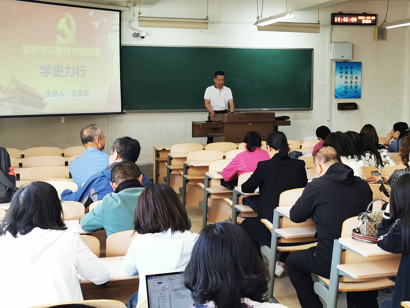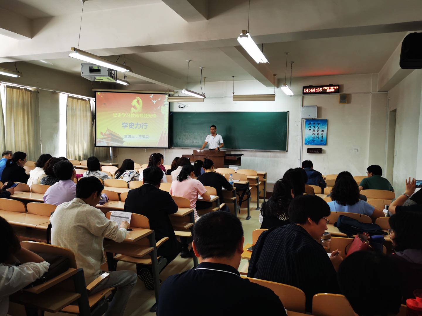 为高标准推进党史学习教育走深走实,全面贯彻落实“学史明理、学史增信、学史崇德、学史力行”目标要求,6月3日,2026世界杯官网党委书记王玉泉以《学史力行》为题在春晖学堂E205为学院全体教职工讲授了一堂立足工作、切合实际、提升能力的党课。