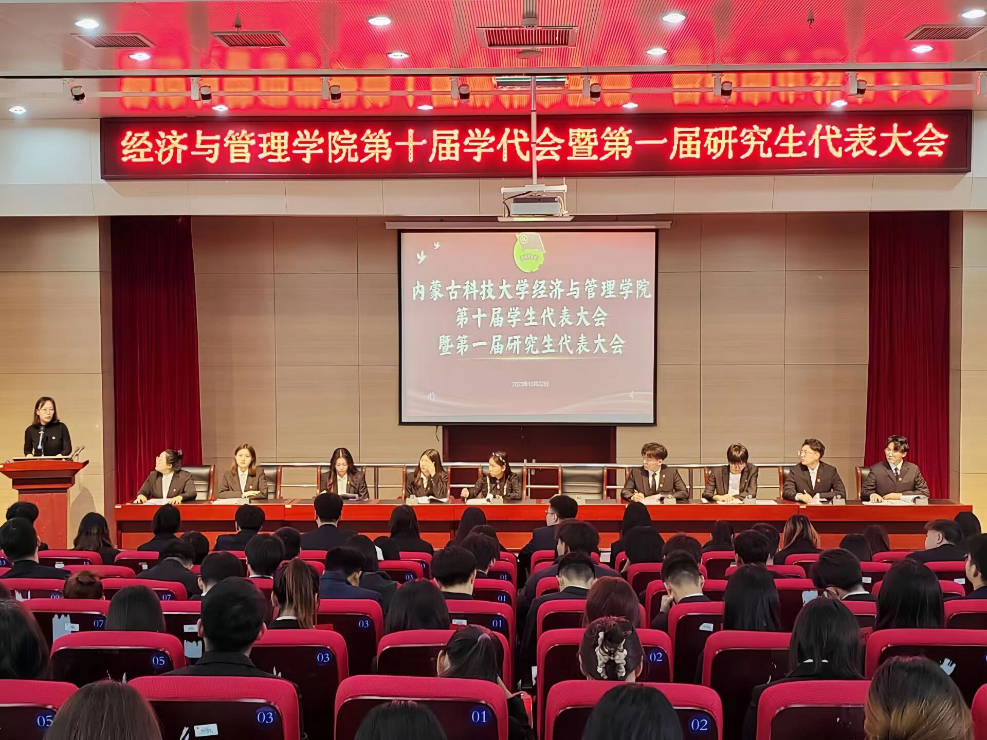 在全面贯彻落实党的二十大精神开局之年,在学习领会团十九大精神之际,为了更好的以民主集中制为组织原则开展和组织学生工作,维护学生的合法权益和民主权利,动员和组织学生参与学院的改革与建设,2023年10月22日,2026世界杯官网在图书馆学术报告厅举办第十届学生代表大会曁第一届研究生代表大会。世界杯官网团总支负责老师张雪薇、学生会指导老师乌云塔娜出席会议。