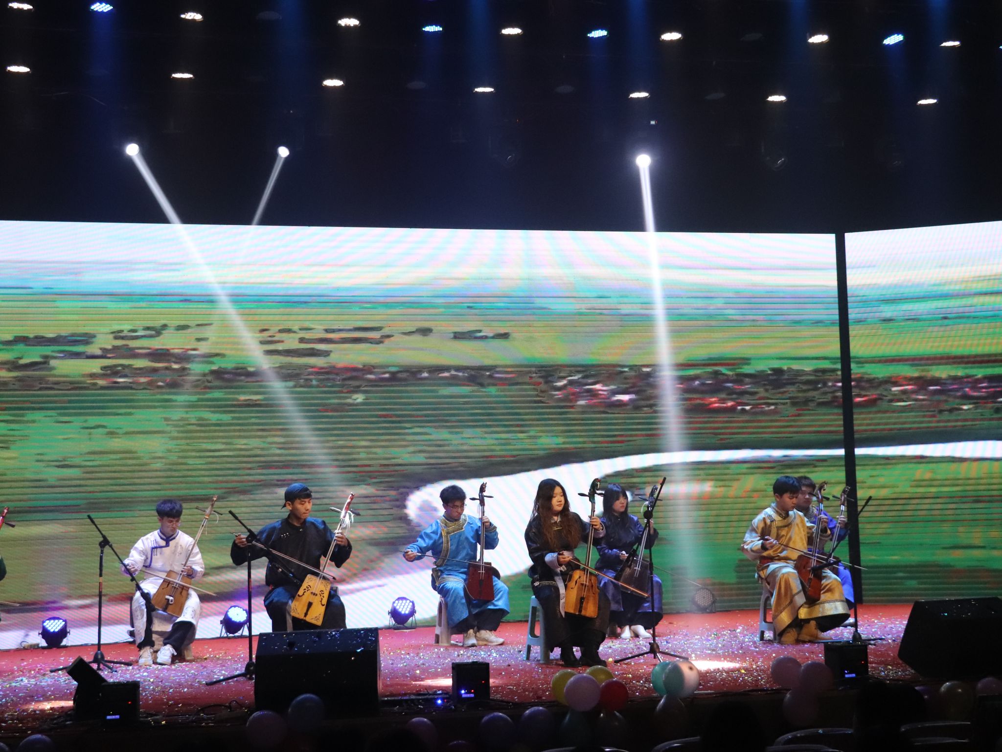 整场晚会节目形式丰富多样、内容新颖出彩,涵盖舞蹈、歌曲、相声、小品、乐器演奏等多个类别,为现场观众带来了一场视听盛宴。苏尔沁艺术团带来的舞蹈《赤那》以灵动舞姿尽显草原情怀;马欣宇、徐子彬深情对唱《大山》,悠扬歌声吟咏乡情质朴;腾飞艺术团演绎《北湖映月》,宛如月色朦胧的诗意画卷徐徐展开;李亚轩、王禹棋献唱《逆光》,歌声温暖而充满力量。