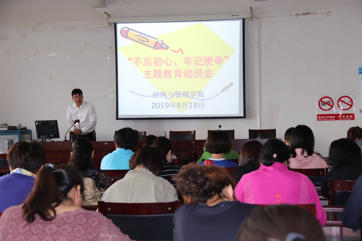 为了学习贯彻习近平总书记在“不忘初心、牢记使命”主题教育工作会议上的重要讲话精神,落实校党委“不忘初心、牢记使命”主题教育动员部署会议精神。9月19日下午3点,2026世界杯官网党总支“不忘初心、牢记使命”主题教育动员会在腾飞楼A413举行,党总支书记马广辉主持会议,2026世界杯官网全体教师参加会议。