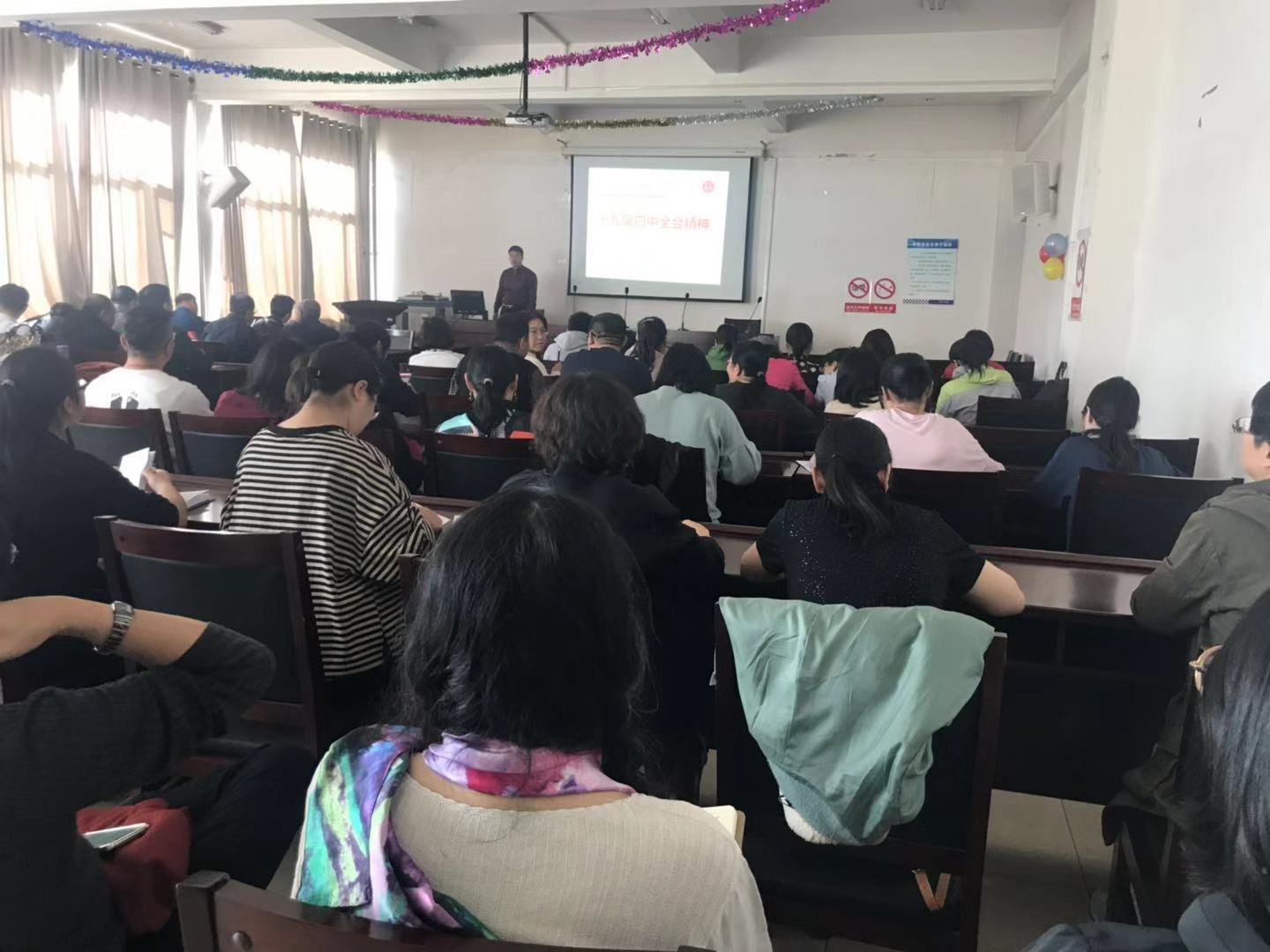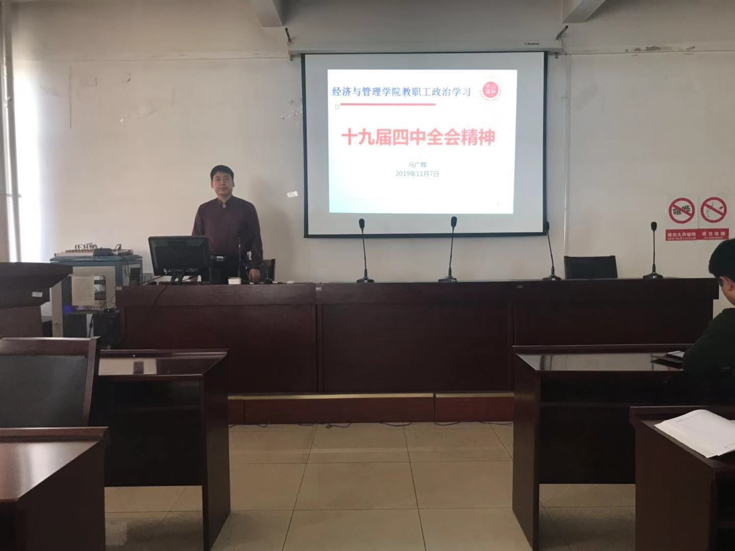 党总支书记马广辉主持会议并作了专题讲座——学习《十九届四中全会精神》。会议介绍了十九届四中全会概况、强调了学习十九届四中全会精神的重大意义、梳理了十九届四中全会通过的《中共中央关于坚持和完善中国特色社会主义制度 推进国家治理体系和治理能力现代化若干重大问题的决定》结构,重点介绍了与高等教育密切相关的制度要求。
