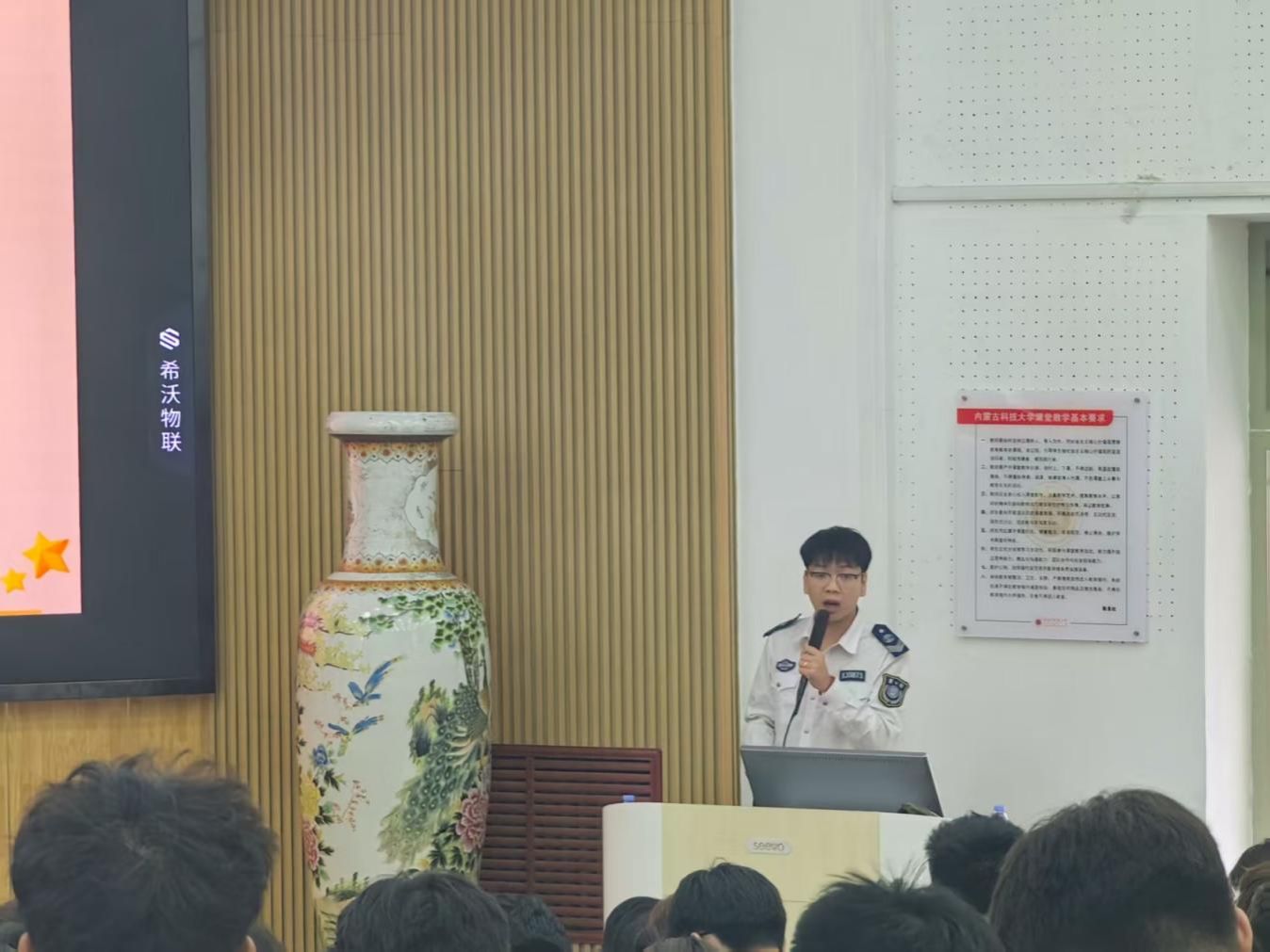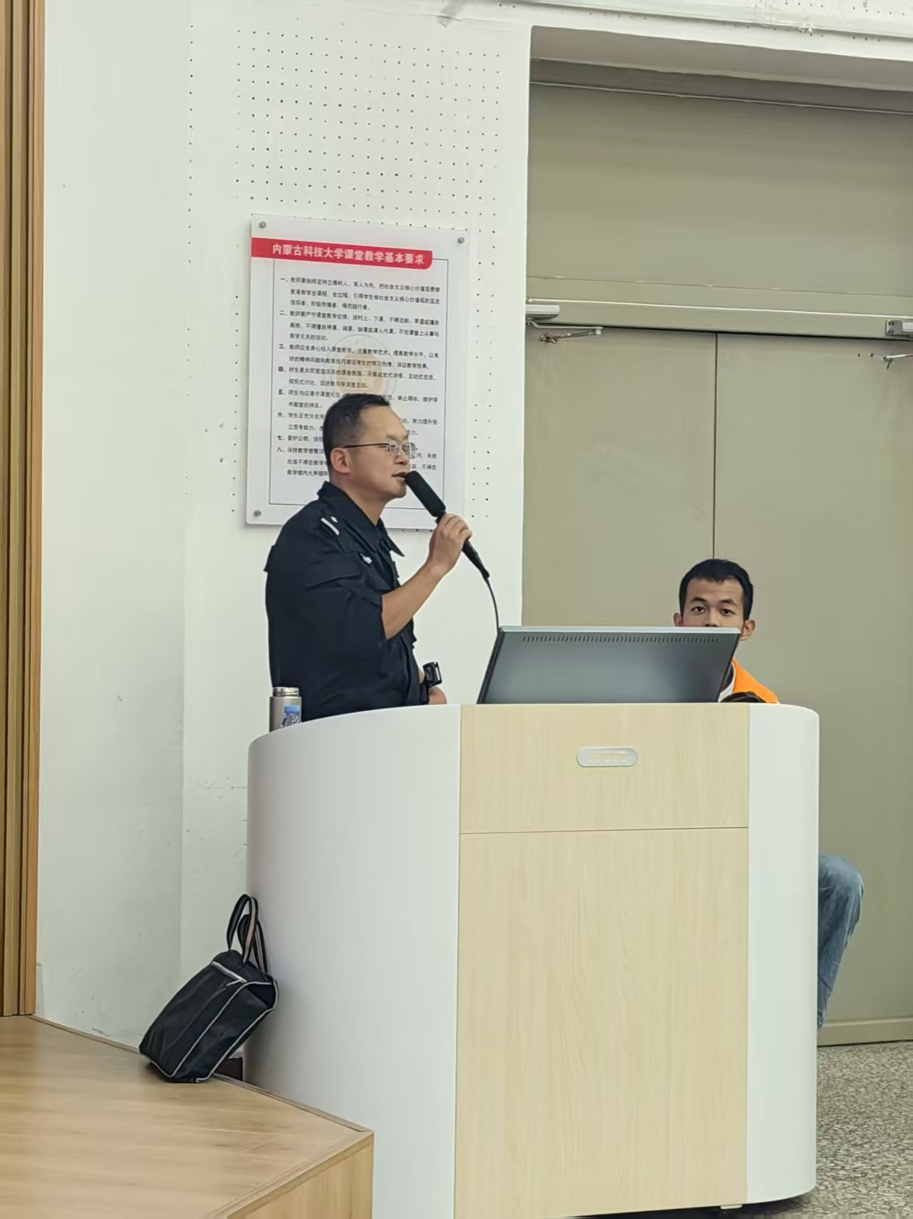 在消防安全知识普及培训讲座上,学院邀请包头市公安局教培支队警务理论教研室主任艾广勇及包头市安全健康教育中心讲师张恒,分别就如何远离和防范诈骗,正确预防和处理火灾等内容,通过鲜活的案例和诙谐的讲解,对新生进行了专题安全教育知识科普。