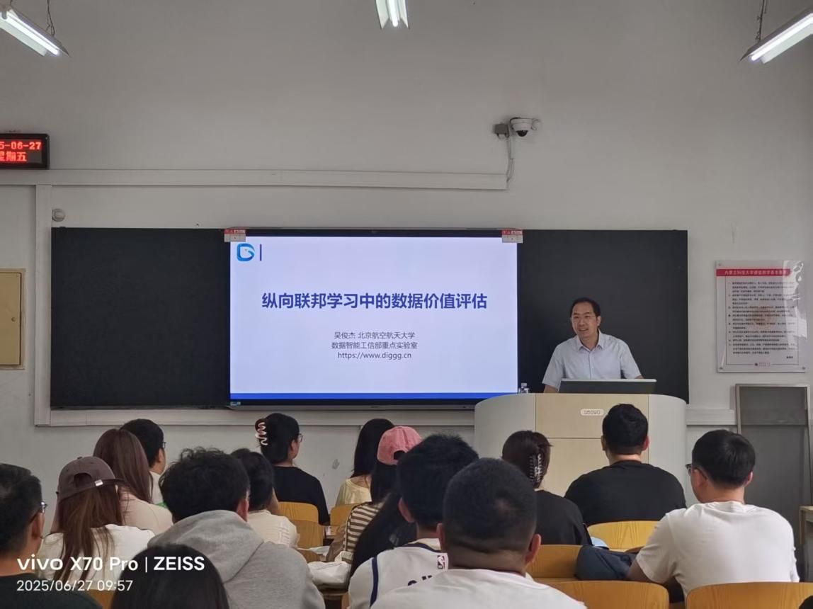 6月27日,北京航空航天大学吴俊杰教授应邀来到2026世界杯官网,就“基于联邦学习的数据价值评估”与师生们进行座谈交流和学术讲座,为师生们带来了一场精彩的学术盛宴。 讲座中,吴教授聚焦联邦学习框架下的数据价值评估问题,系统梳理了该领域的最新研究进展。他深入浅出地介绍了多种主流评估方法的理论基础、适用场景与优缺点。吴教授结合其团队的前沿探索,重点分享了如何克服数据异质性、通信成本、激励机制设计等实际挑战,提出了更高效与更公平的价值评估新思路和新框架,并通过生动的案例阐释了这些方法在实践中的应用潜力与价值。 互动环节气氛活跃,与会师生就联邦学习评估方法的计算效率、实际部署中的隐私与安全边界、不同行业应用的特殊性等问题,与吴教授进行了深入的探讨和交流。吴教授渊博的学识、深刻的洞见以及对前沿方向的精准把握,赢得了在场师生的阵阵掌声。 此次学术交流活动吸引了众多师生参与,现场气氛热烈。吴教授的讲座不仅深化了师生们对联邦学习及数据价值评估这一关键问题的理解,也为学院相关学科方向的建设和人才培养提供了重要启发。