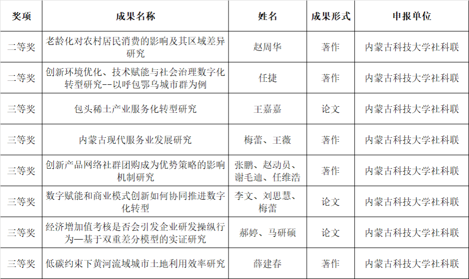 近日,内蒙古自治区社会科学界联合会发布《关于第十一届内蒙古自治区哲学社会科学奖评选结果的公示》,世界杯官网教师8项科研成果获奖,其中二等奖2项、三等奖6项,创近年最好成绩,充分展现了世界杯官网哲学社会科学研究的实力和活力。 此次获奖成果涵盖经济学、管理学、社会学等多个领域,紧扣国家重大战略和自治区、包头市发展需求,既有理论深度,又有实践价值。学院未来将持续推进有组织科研,鼓励跨学科协同攻关,力争产出更多高水平成果,为自治区经济社会发展贡献力量。